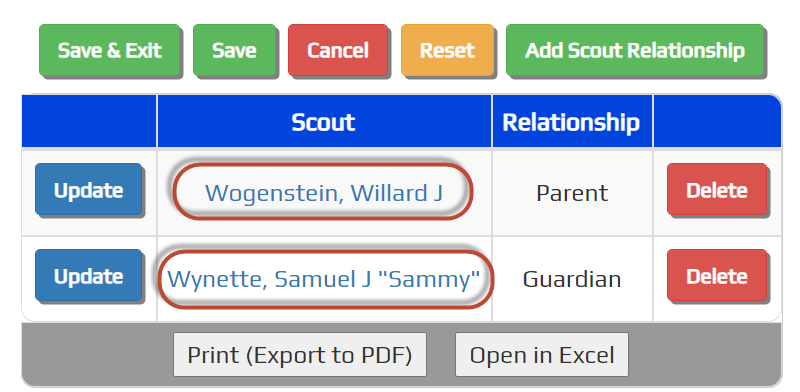 When you update an adult from the Active Adults page, you may now go directly to that person's scouts from the Relationships grid at the bottom of the page, as shown here: