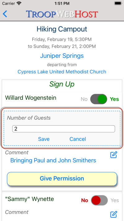 When you sign up for an event on the mobile app calendar, if the event is configured to allow guests, you may now enter the number of guests each participant plans to bring.