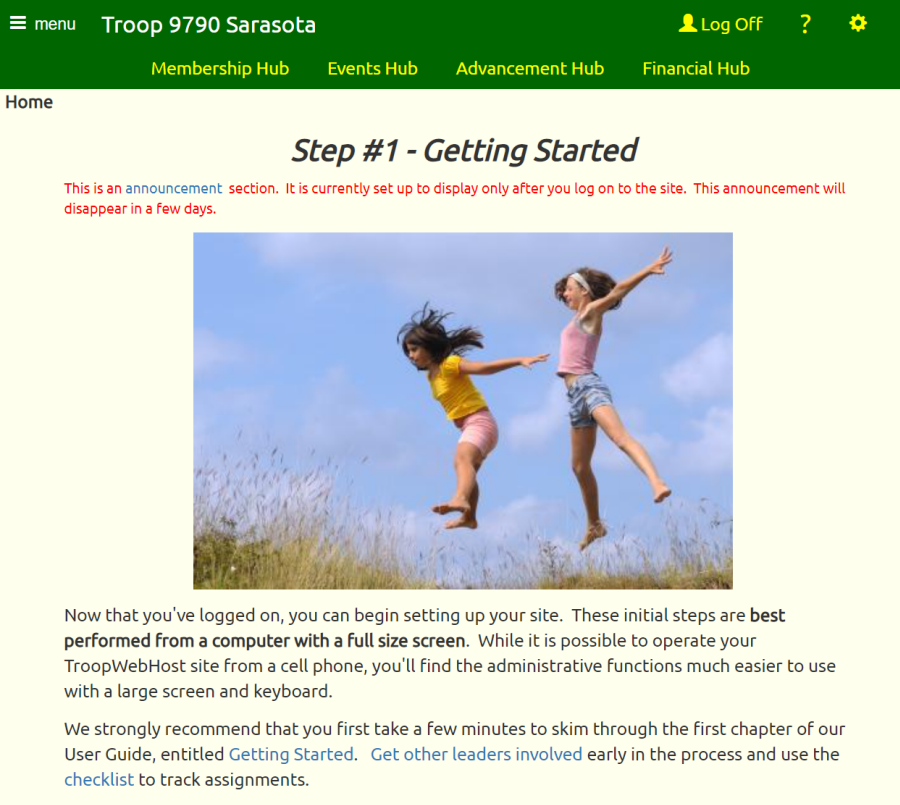 TroopWebHost sites created after February 18 have a new initial Home page, which will make it easier for new subscribers to get started.