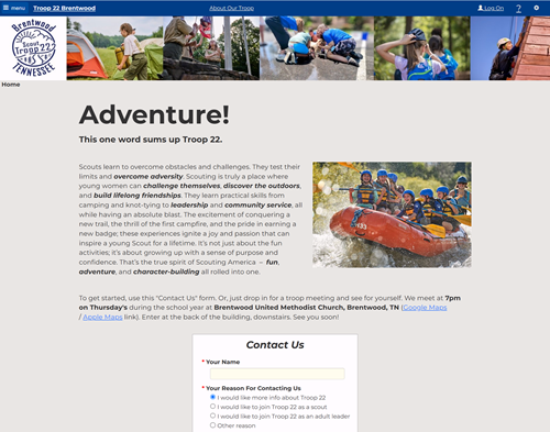 Those are the words that came to mind when we saw the Troop 22 site. There are only three public pages, but that's all they need to made the case for joining Troop 22, which comes down to a single word: Adventure!